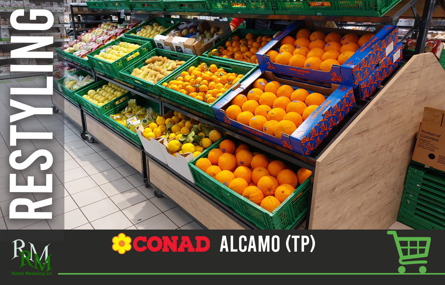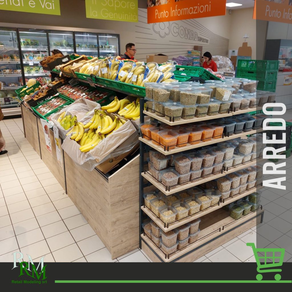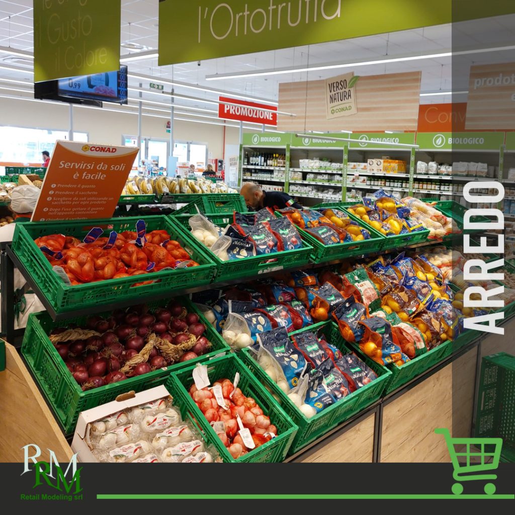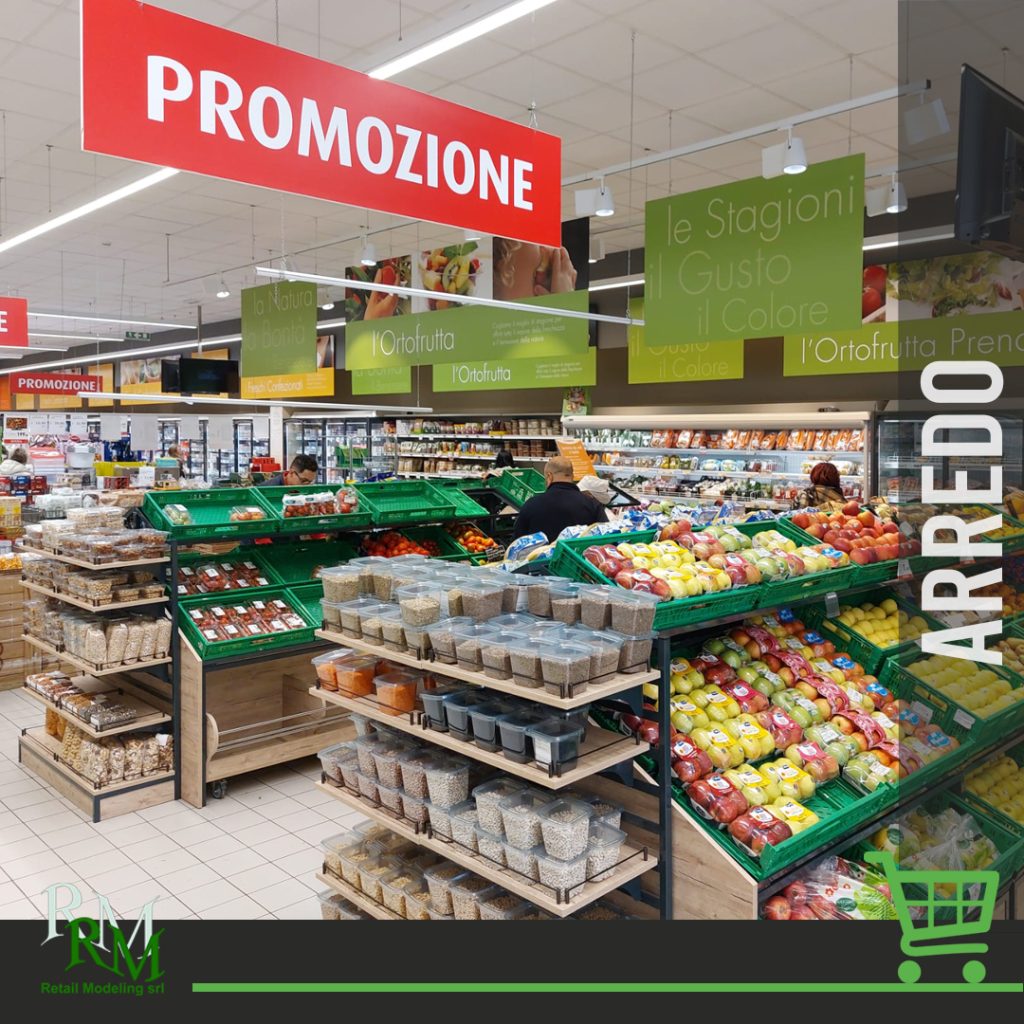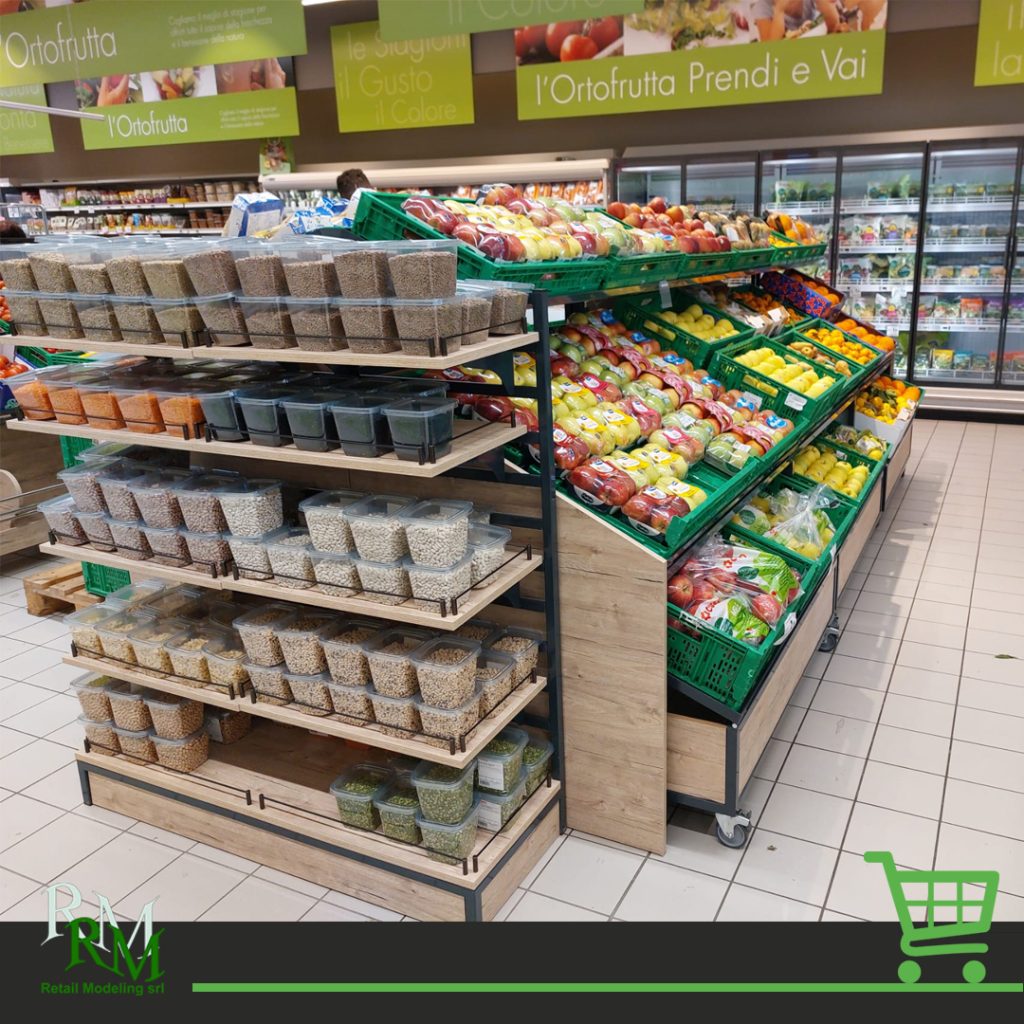 Reparto ortofrutta rinnovato con arredo Retail Modeling: stessa area ma 24 cassette in piรน di esposizione rispetto alla situazione precedente!